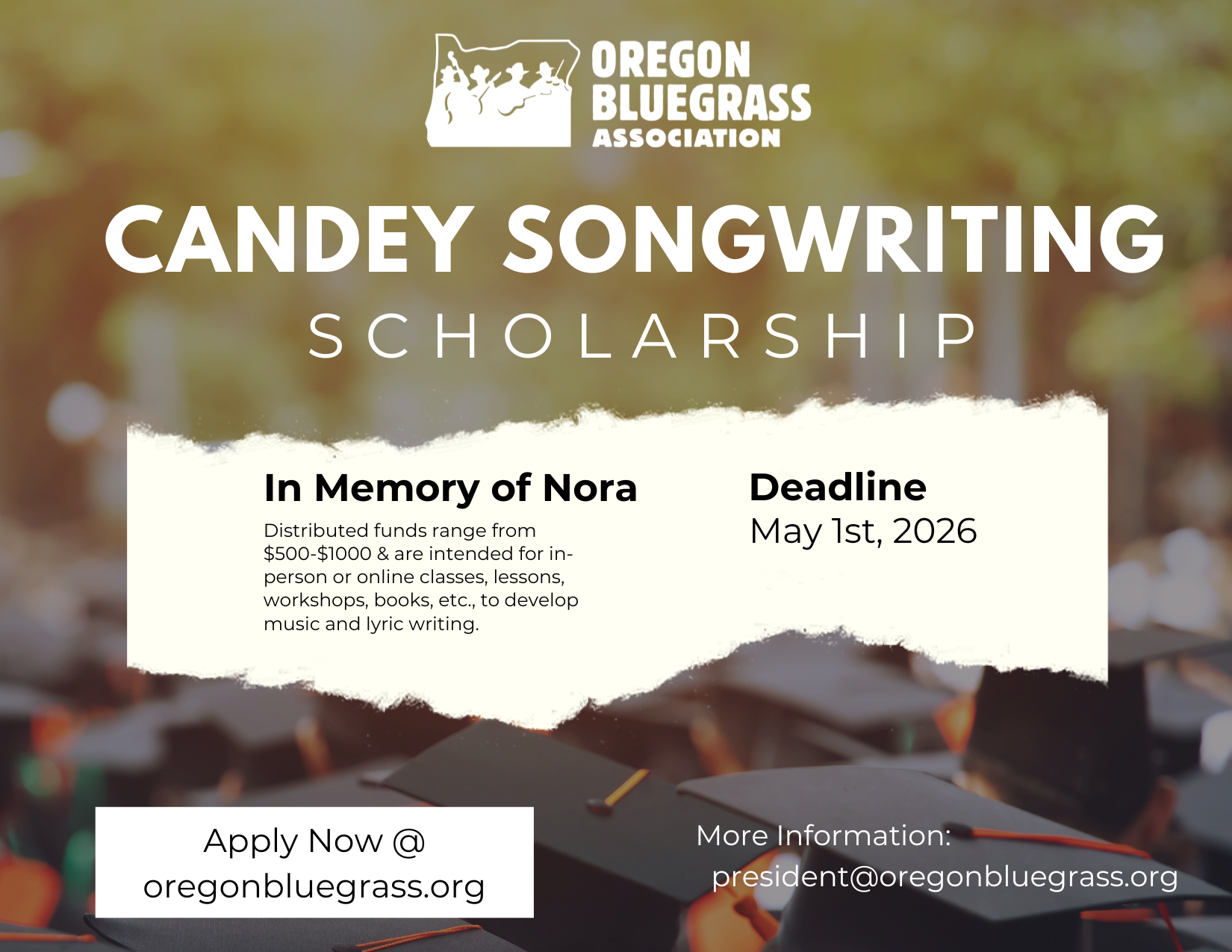 The purpose of the Scholarship is to aid anyone looking to further their development of original music and lyrics through classes, workshops, lessons, etc. The deadline for submissions is May 1st, 2026 with the award to be announced at the OBA Annual Meeting at the end of May.